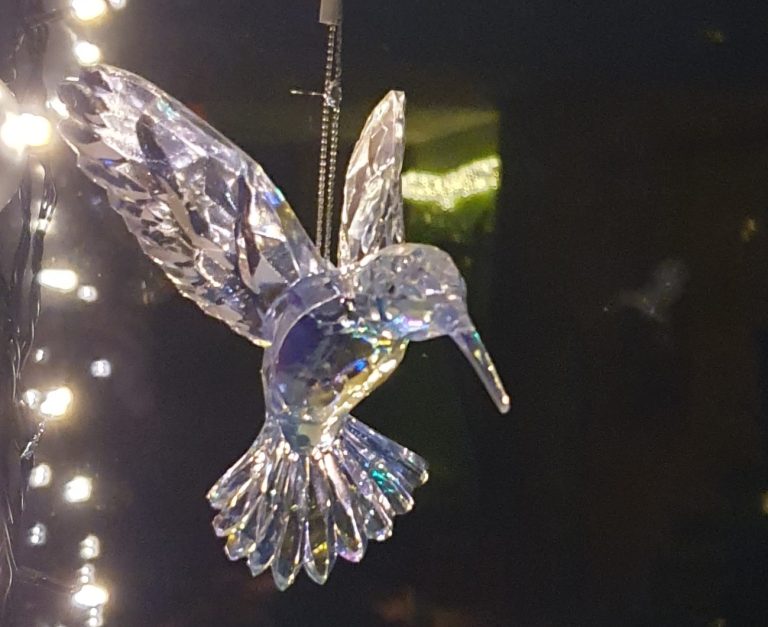 Zie hier een vogel bij daglicht en dezelfdevogel in het donker, met alleen de kerstverlichting als licht. Deze vogel laat alles doorschijnen en de omgeveing bepaalt de kleur. Zo vertekent de omgeving ieder van ons ook, wij kleuren er nog…